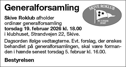 Skive Roklub afholder ordinær generalforsamling torsdag d. 19 februar 2026.